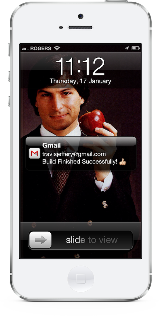 I’ve got an iPhone, a Gmail app with push notifications, and Xcode can run scripts when builds finish… let’s do this!